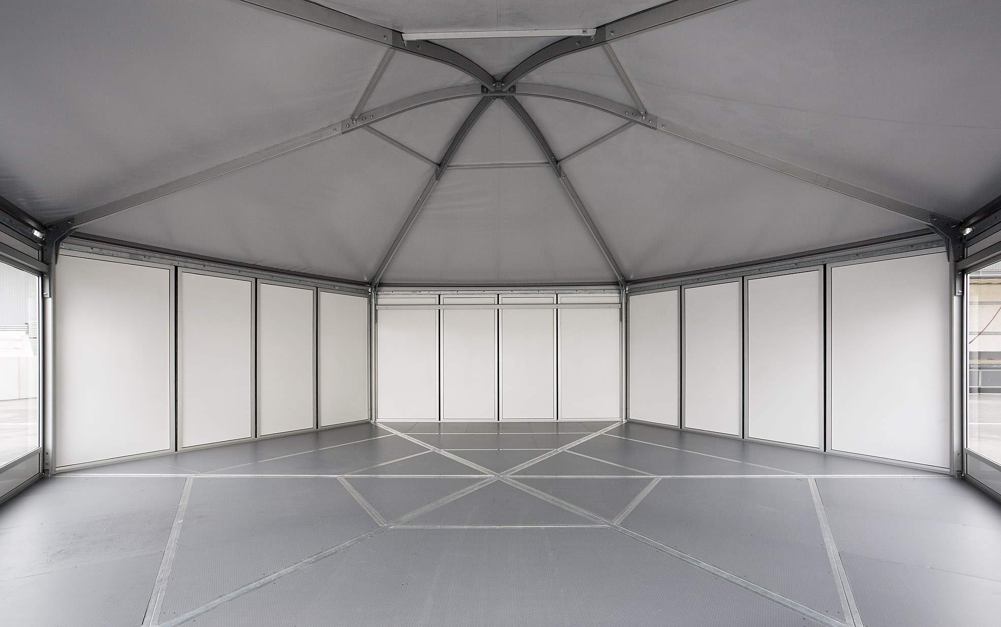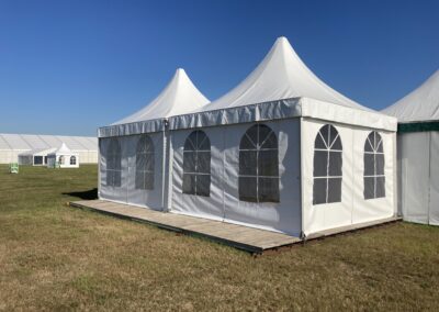Ob freistehend oder verbunden, in Reihe oder versetzt: Dank quadratischer und rechteckiger Grundrisse unserer Pagoden in verschiedenen Größen lassen sich in kürzester Zeit aufregende temporäre Räumlichkeiten schaffen. Mit der sechs- und achteckigen Grundform und dem eleganten Membrandach sind unsere Domizile für jede Event-Landschaft ein belebendes Element.